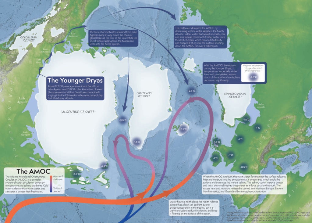 That’s exactly what seems to have happened when the waters of Lake Agassiz spilled into the Atlantic. Because the AMOC moves heat north from the equator, temperatures plunged across the northern hemisphere. In some regions, they dropped by more than ten degrees Celsius in a matter of decades.