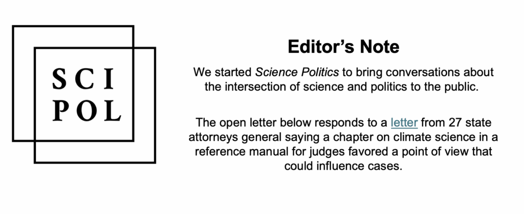 We were therefore distressed to learn of a letter by 27 Republican state attorneys general, led by J.B. McCuskey of West Virginia, that attacked the chapter on climate science included in the Fourth Edition of the Reference Manual. The letter claimed that the chapter was biased and would compromise the impartiality of the judiciary. A week later, Judge Robin Rosenberg, the Director of the Federal Judicial Center, responded that the climate science chapter had been omitted from the Reference Manual.