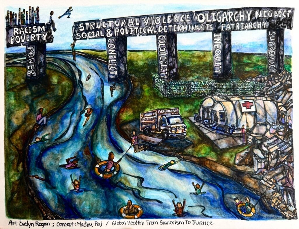 To make this point, I’ve used the upstream-downstream metaphor, illustrated in the image below. The artist tries to capture a savioristic model of global health or development, which involves rescuing drowning kids without confronting deeper questions about why kids are being pushed into the river.